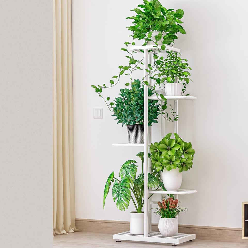 Multi-Layer Modern Flower Stand – a stylish 5-layer metal structure perfect for displaying plants. This versatile home decor stand serves as an ideal planter organizer, enhancing your indoor garden or balcony display. Crafted from metallic materials in a chic Gold & White color combination, this stand adds a touch of contemporary elegance to your living space. Sized at 82x43x22cm, it's a perfect blend of form and function.